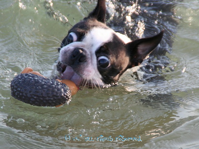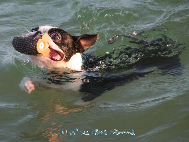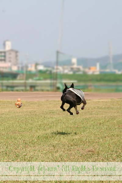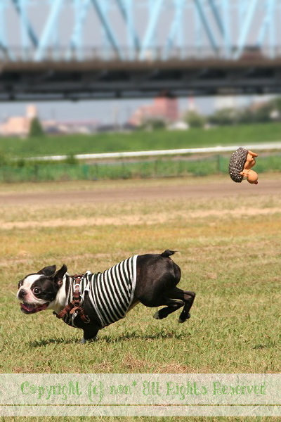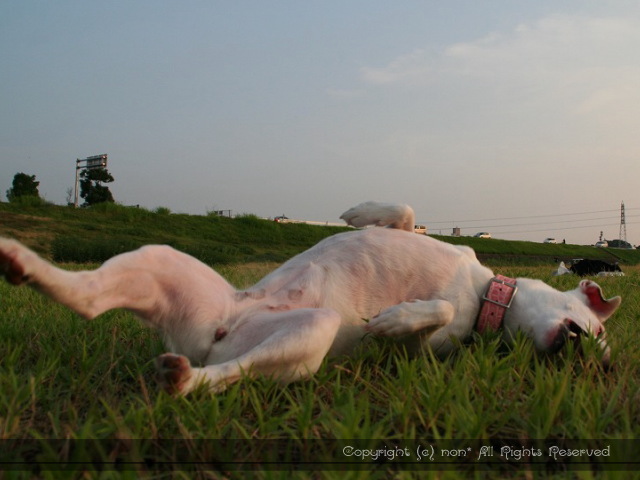 お腹の調子がよくないので仕方にゃい。。。暑いけど川原へ♪